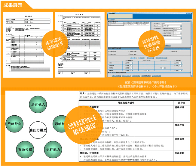 搭建“管理层胜任素质测评系统”IT平台,建立人才测评中心,使企业能够通过使用科学、客观、成熟的人才测评技术, 在较短时间内准确掌握现有管理层人员、后备管理层人员的个性特征、能力结构、职业倾向等全面素质; 开展相关技术培训,帮助企业内部人力资源管理人员掌握“管理层胜任素质测评系统”的操作技巧和实施流程。