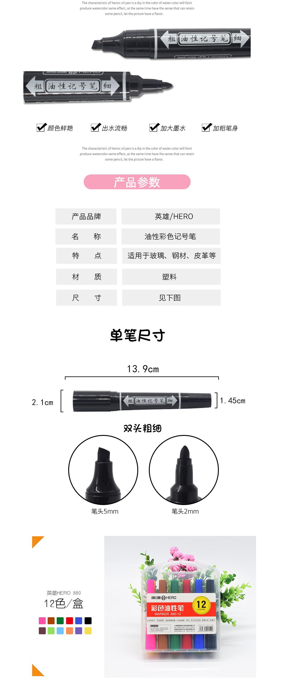 英雄12色双头油性笔 12支装 细