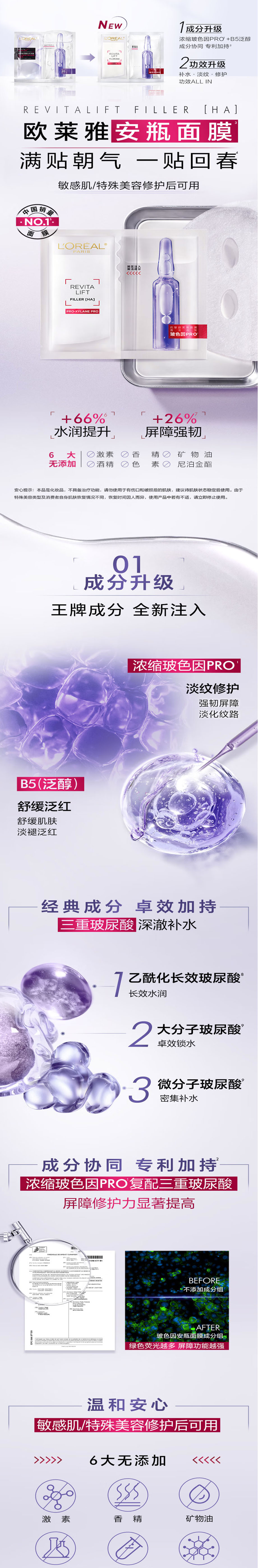 美妆个护> 欧莱雅复颜玻尿酸水光充盈导入安瓶鲜注玻色因面膜 33g*5片