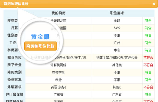 黄金眼功能可以查看您的简历与应聘职位的匹配度,并将您的简历与两周内投递过该职位的其他求职者简历进行比较